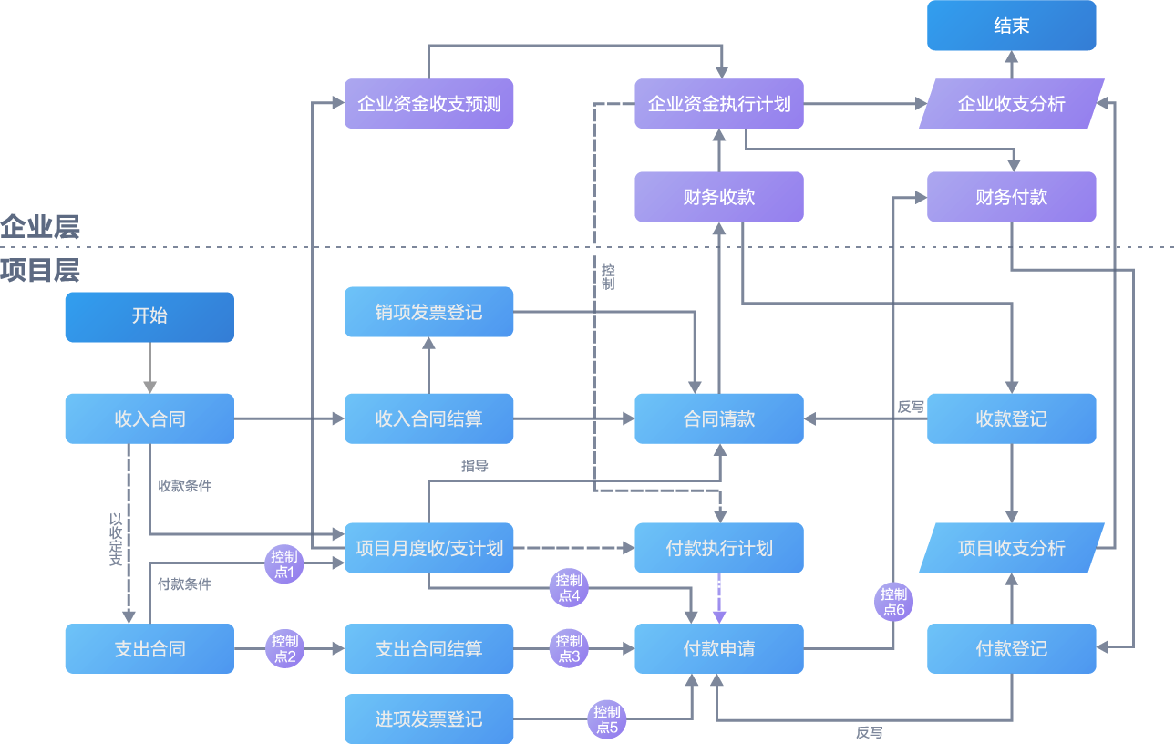 基于金蝶云·星瀚,打造从合同到财务付款的资金管控体系,满足企业在支付方面多场景、多种类的述求,企业可通过灵活定义管控策略,调整资金流转的需求,支持项目层与企业层的资金协同管控,让项目资金管理更高效